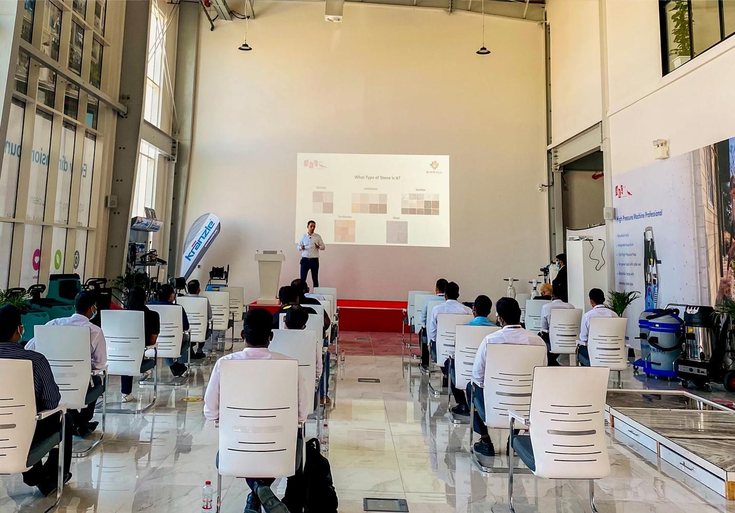 In Akc we believe that practical learning is the best kind of learning, so we built our headquarters to include a demo zone, where we could demonstrate and create an experience. Our team had the pleasure to hold an exclusive training session at our headquarters in Jebel Ali, to which we invited our partners in cleaning, Emrill Facility Management. The theoretical seminar, which was held along with practical testing and applied learning, was very informative, in which it shared our team’s long-term experience and expertise, when it comes to natural stone care, maintenance, protection, and cleaning.